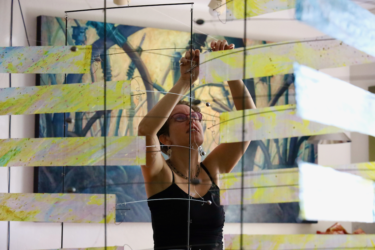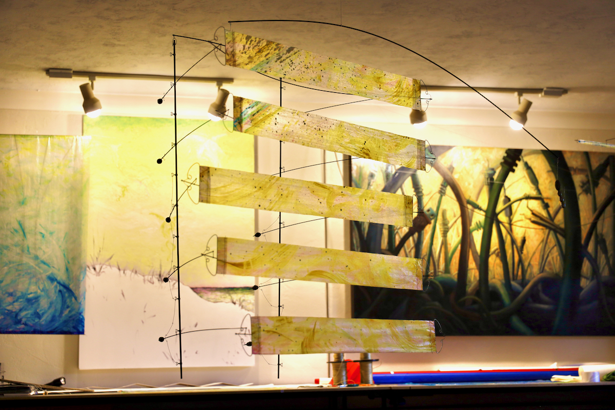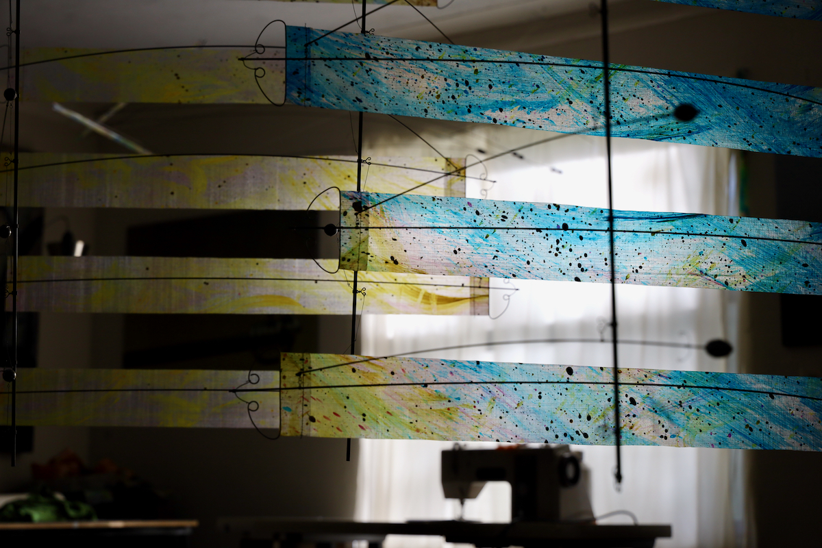 For this test Ruth painted a large rectangle with an abstracted slice of atmosphere. She imagined air currents and molecules floating around down at ground level and all the way up into the dark of space. We then slit this large vertical rectangle horizontally into 15 fat strips.