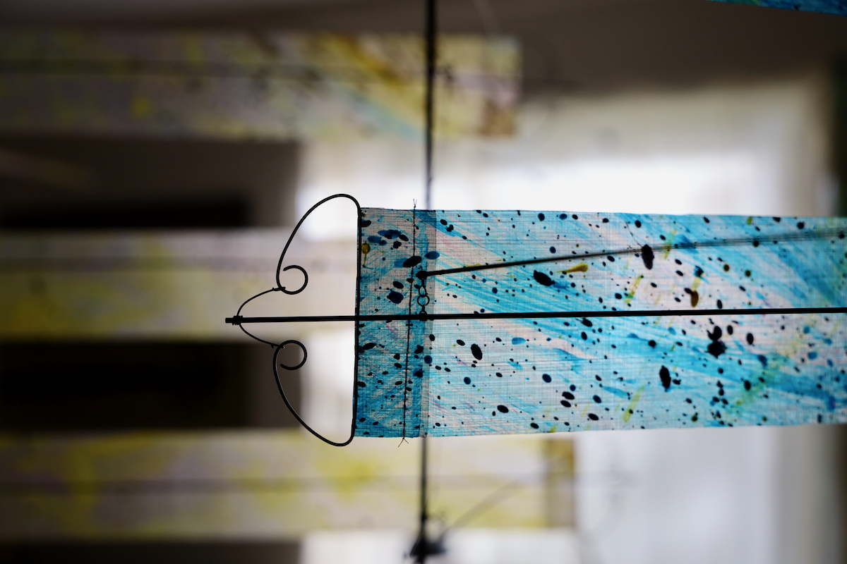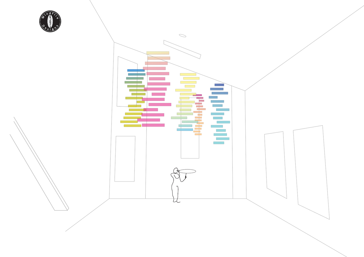 The working title is AirColor Stacks. The current prototype uses 15 strips and hangs about 9 feet when fully assembled. This moves with the air. |